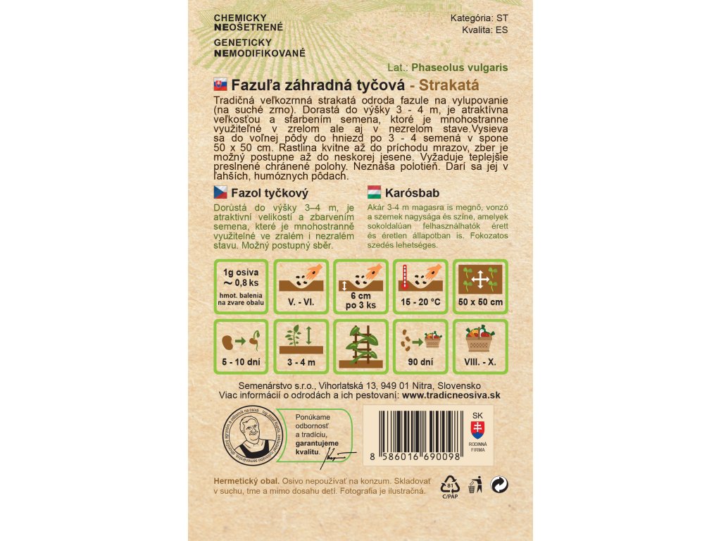 Táto fazuľa dorastá do výšky až 2–3 metre, preto je ideálna na pestovanie pri kolíkoch alebo sieti. Jej strakaté semená sú nielen dekoratívne, ale aj plné bielkovín a vlákniny, čo z nej robí hodnotnú súčasť zdravej kuchyne. Pestovanie je nenáročné, odroda je odolná a spoľahlivo plodí aj v našich podmienkach.