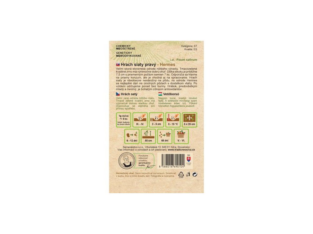 Hermes je spoľahlivá, veľmi skorá odroda dreňového hrachu s kompaktným, nižším porastom. Vyznačuje sa kvalitným sladkým zrnom a vyrovnanými strukmi (cca 7,5 cm, ~7 semien), preto sa výborne hodí na priamy konzum aj spracovanie. Najlepšie sa mu darí v úrodnej pôde s dostatkom vlahy, pri rovnomernej zálievke dáva skorú a bohatú úrodu.