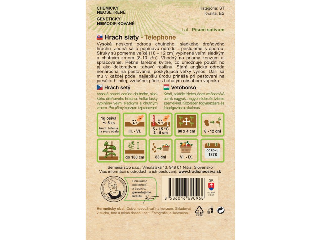 Telephone patrí medzi klasické vysoké hrachy na zelené zrno. Po pevnej opore sa ťahá do 150–200 cm a pravidelne nasádza dlhé, rovné struky s plným, sladkým zrnom. V chladnejšom jarnom počasí štartuje spoľahlivo, zber trvá dlhšie obdobie najmä pri pravidelnom oberaní. V kuchyni sa osvedčí čerstvo uvarený s maslom a bylinkami, v polievkach, rizote aj ako zásoba do mrazničky (po krátkom blanšírovaní si drží farbu aj sladkosť).