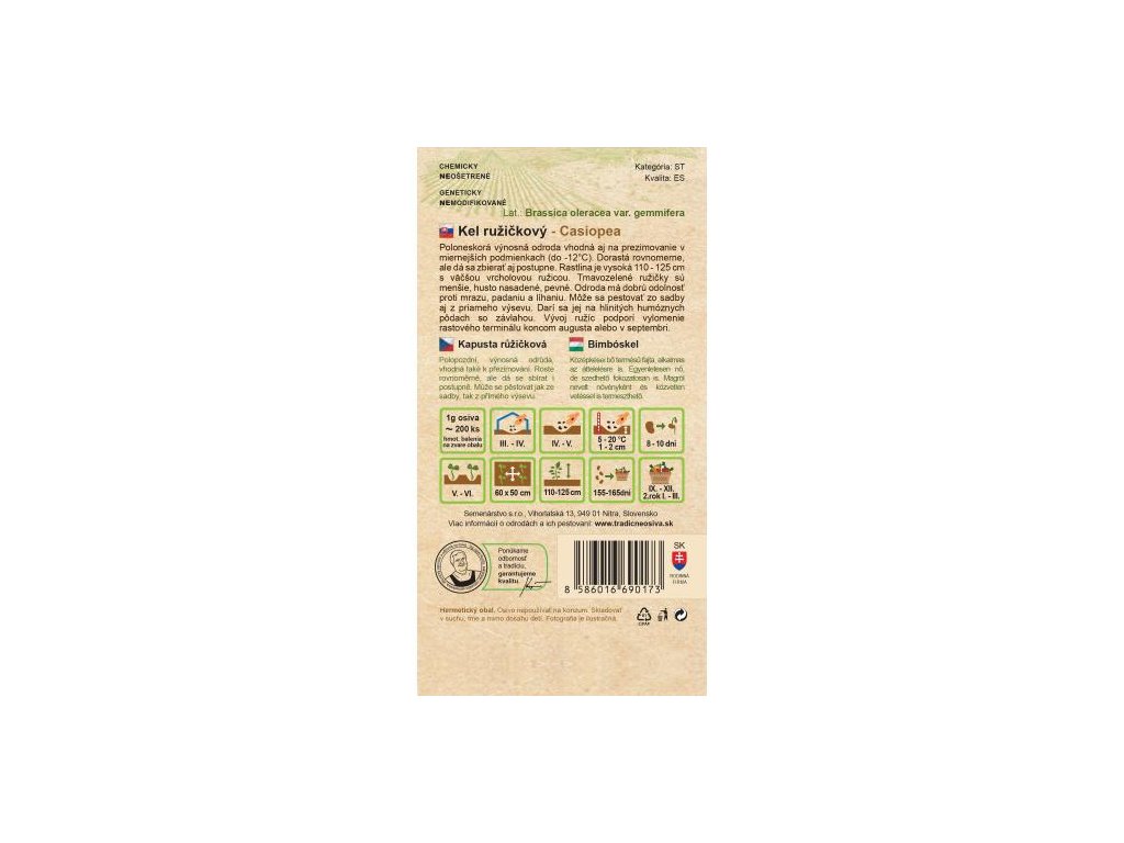 Casiopea tvorí silné, vzpriamené rastliny (≈ 80–110 cm) s bohatým nasadením ružičiek od bázy po vrchol. Ružičky sú kompaktné, jemne sladkasté, dobre držia tvar pri varení a po krátkom blanšírovaní sú výborné na mrazenie. Porast zvláda chladné jesenné počasie a vďaka pevnej stonke umožňuje postupný, dlhý zber. V kuchyni sa uplatní od panvice cez pečenie až po „one-pot“ recepty s koreňovou zeleninou.