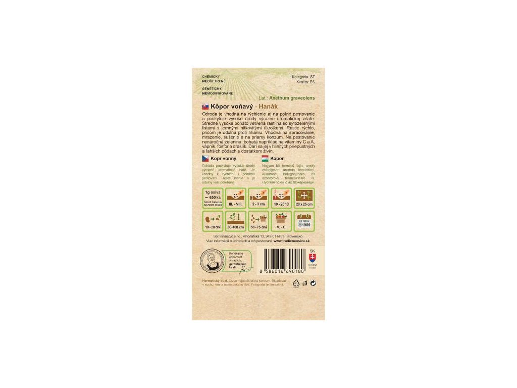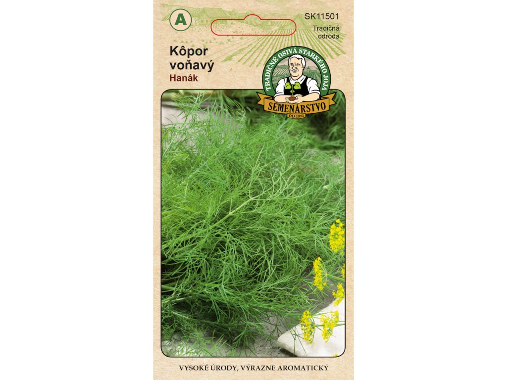 Hanák tvorí sviežu, tmavozelenú vňať s vysokým obsahom silíc a príjemne korenistou vôňou. Rastliny sú vyrovnané, so spoľahlivým nástupom kvitnutia – takže si z jedného záhona odnesieme najprv jemné listy a neskôr aj okolíky do pohárov. Kôpor miluje slnko a rovnomernú vlahu; v záhone sa najlepšie darí z priamych výsevov a pri postupných sejbách budeme mať čerstvú vňať celé leto.