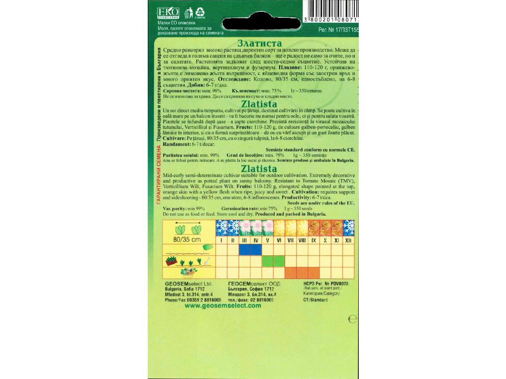 Paradajka Zlatista je poloskorý, stredne vysoký (polodeterminantný) kolíkový rajčiak z bulharského šľachtenia Geosem, určený predovšetkým na priame poľné pestovanie, no výborne sa jej darí aj vo väčších nádobách na slnečných balkónoch a terasách. Rastliny sa vedú pri opore, najčastejšie na jeden výhon so sponom okolo 80 × 35–40 cm, pričom prirodzene končia po 6.–7. súkvetí – starostlivosť je tak jednoduchšia a rast nie je nekonečný. Vyznačuje sa veľmi dobrou vitalitou a odolnosťou voči tabakovej mozaike, verticíliu a fuzáriu, takže porast zostáva dlhšie zdravý aj v menej ideálnych podmienkach.