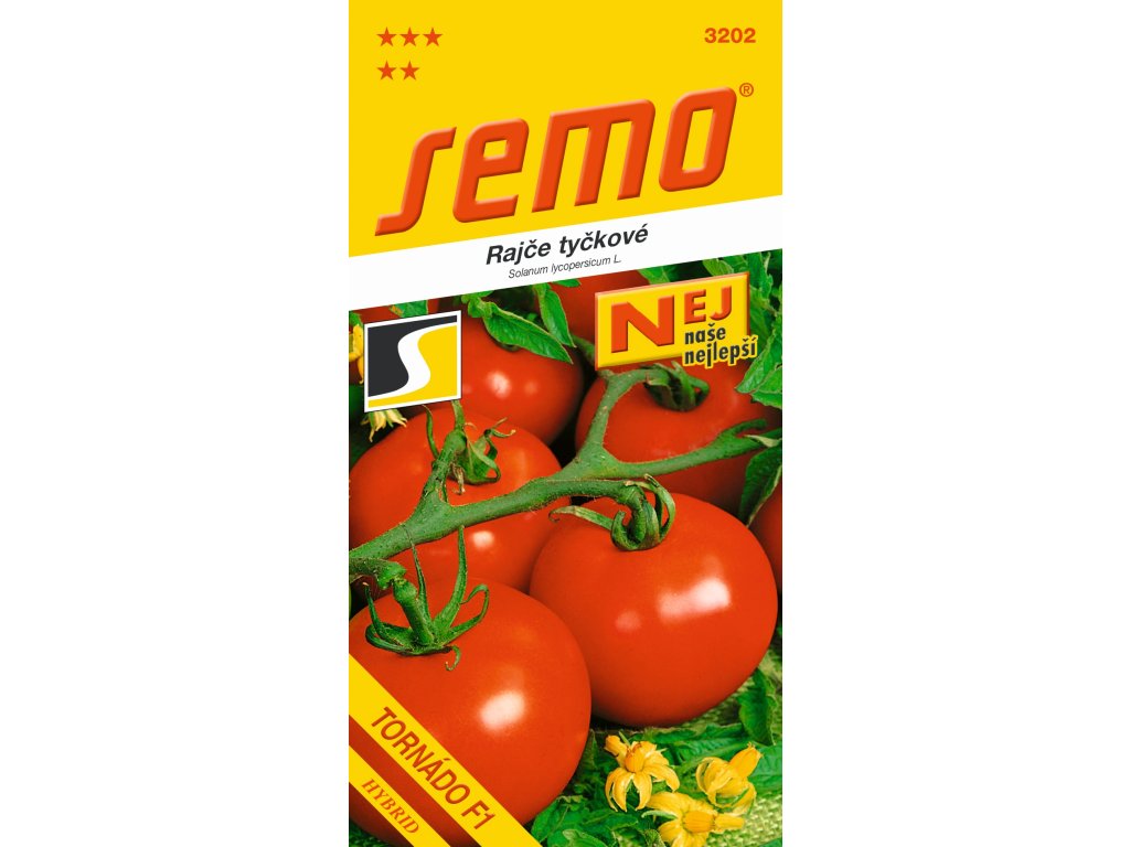 Tornádo F1 je stále mimoriadne populárny poloraný kolíkový hybrid z ponuky SEMO, určený pre hobby pestovateľov aj menších pestovateľov, ktorí chcú istotu úrody. Rastlina je indeterminantná (neobmedzene rastúci rajčiak), silná a plastická – dobre sa prispôsobuje rôznym podmienkam pestovania v skleníku, fóliovníku aj na voľnom poli. Pri vedení na opore a pravidelnom vyštipovaní zálistkov vytvára prehľadný porast so stabilnou násadou plodov počas celej sezóny. Plody patria do kategórie stredne veľkých rajčiakov: sú guľaté až plocho guľovité, hladké, bez žíhania, v zrelosti tmavočervené. Hmotnosť sa v našich podmienkach pohybuje okolo 80–100 g (v teplejších oblastiach a pri intenzívnom pestovaní aj viac). Dužina je pevná, šťavnatá, s plnou, poctivo paradajkovou chuťou – Tornádo F1 je často spomínané práve ako „rajčina s výbornou chuťou a stabilným výnosom“.