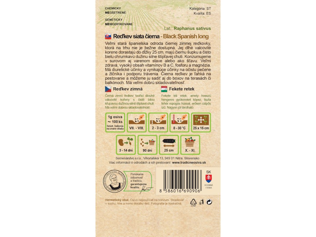 Black Spanish Long je spoľahlivá jesenná odroda na priame výsevy v lete. Pri rovnomernej zálievke dorastá bez dutín, s hladkým povrchom a šťavnatosťou, ktorá sa hodí do šalátov, k mäsu aj na fermentovanie.